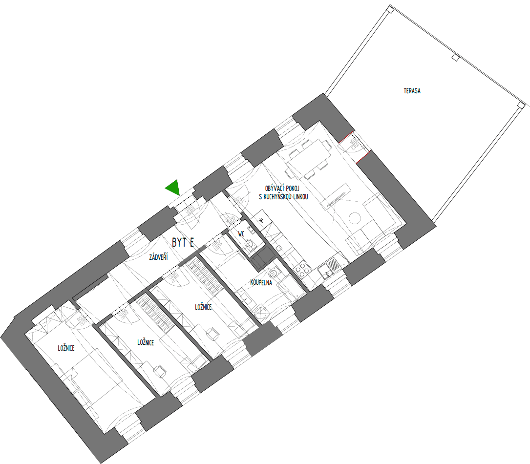 Byt je navržen s důrazem na funkčnost, dostatek denního světla a jasné oddělení denní a klidové části. Terasa představuje jednu z hlavních předností této jednotky a činí z bytu ideální volbu pro ty, kteří hledají komfort bytu v kombinaci s venkovním prostorem.