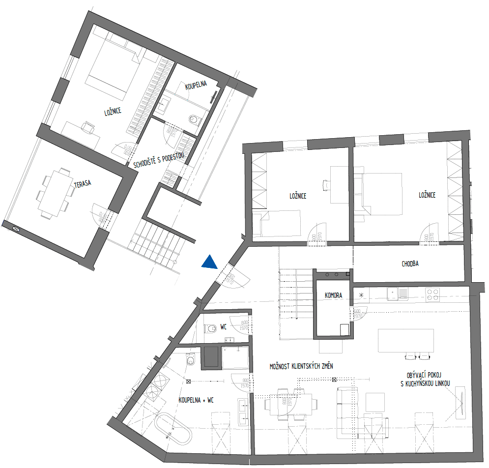 Horní podlaží tvoří otevřený obývací pokoj s kuchyňským koutem a jídelnou o ploše 58,4 m², který je skutečným srdcem bytu a nabízí dostatek prostoru pro rodinný život i společenská setkání. Na obytnou část navazuje terasa o velikosti 15,4 m², ideální pro venkovní posezení nebo relaxaci. Součástí horní úrovně je také další ložnice (18,8 m²), koupelna (5,5 m²), samostatné WC a schodiště s podestou propojující obě podlaží.