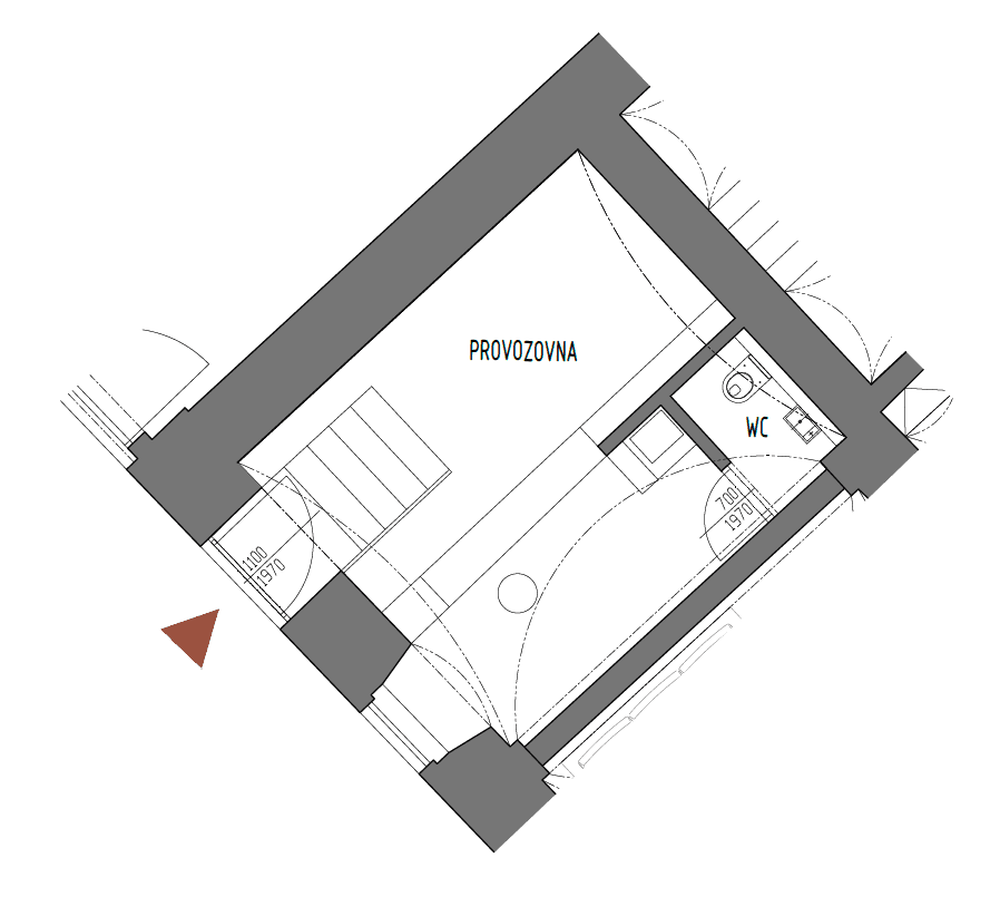 Dispozice tvoří hlavní provozní místnost a samostatné WC, což zajišťuje plný komfort pro každodenní provoz. Prostor je přehledný, funkčně řešený a snadno přizpůsobitelný různým typům podnikání.
